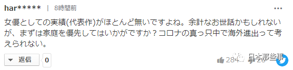 身为一名演员,但是基本没有实绩(代表作)。可能我多嘴了,但是她不如先顾好家庭?现在疫情正是严重的时候,难以想象她还想进军海外。